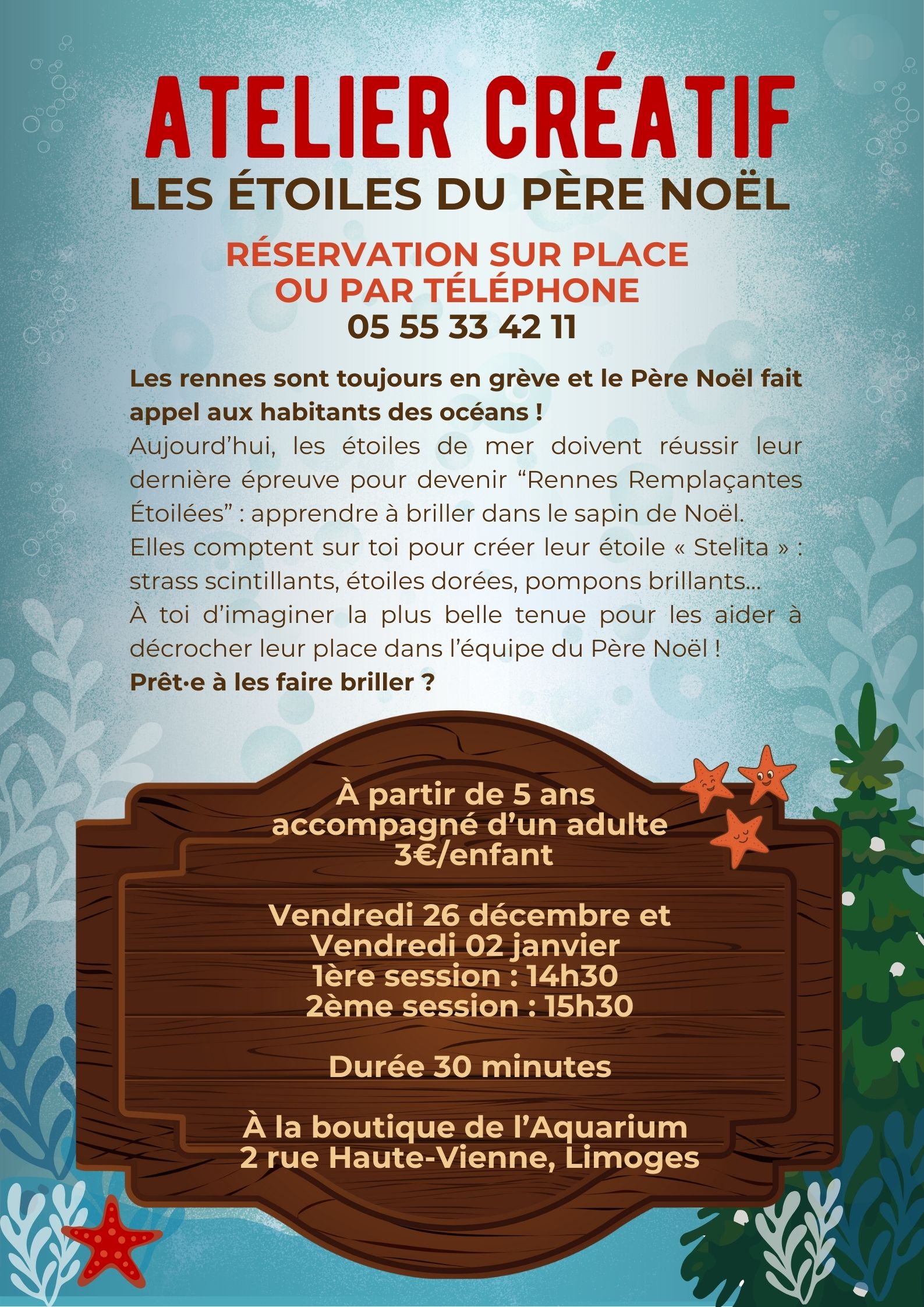 Cette année, les rennes du Père Noël sont en grève ! Les poissons de l’Aquarium se portent volontaires pour aider le père Noël à la place des rennes…mais pour décrocher leur carte de rennes remplaçants, ils doivent réussir leur formation ! Aidez-les en résolvant les énigmes ! (Jeu inclus dans la visite de l’Aquarium. Friandise à la clé !).